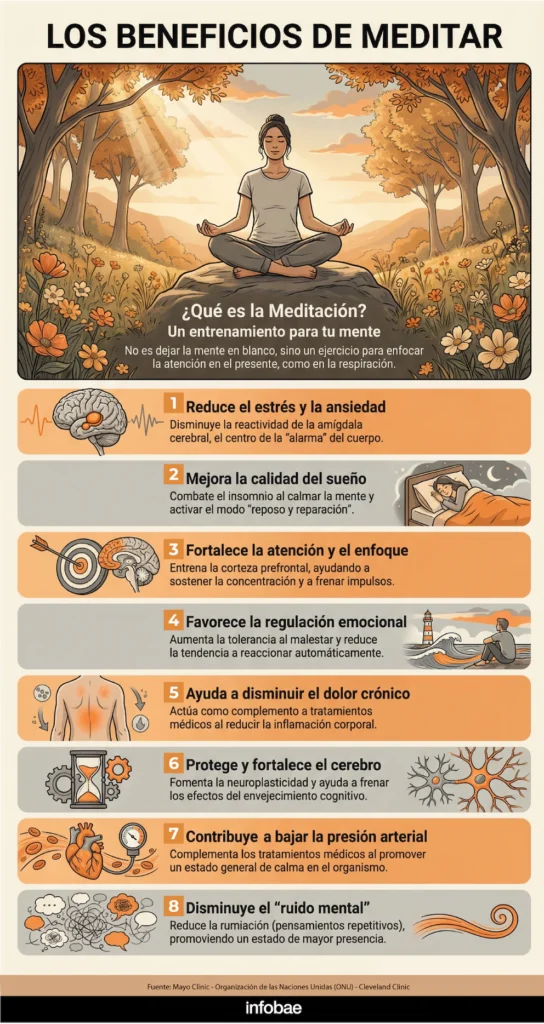 “Disminuye el estrés percibido, mejora la ansiedad y los síntomas depresivos en magnitud pequeña a moderada según revisiones y metaanálisis. También favorece la regulación emocional, la tolerancia al malestar y la reducción de rumiación”, señaló el neurólogo.